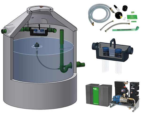 Set mit allen Komponenten für die Regenwassernutzung im Haus